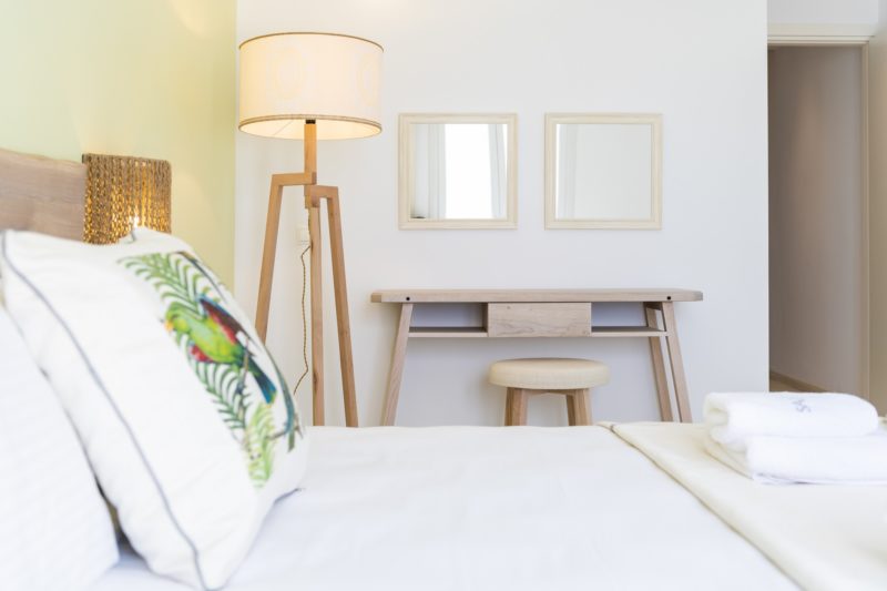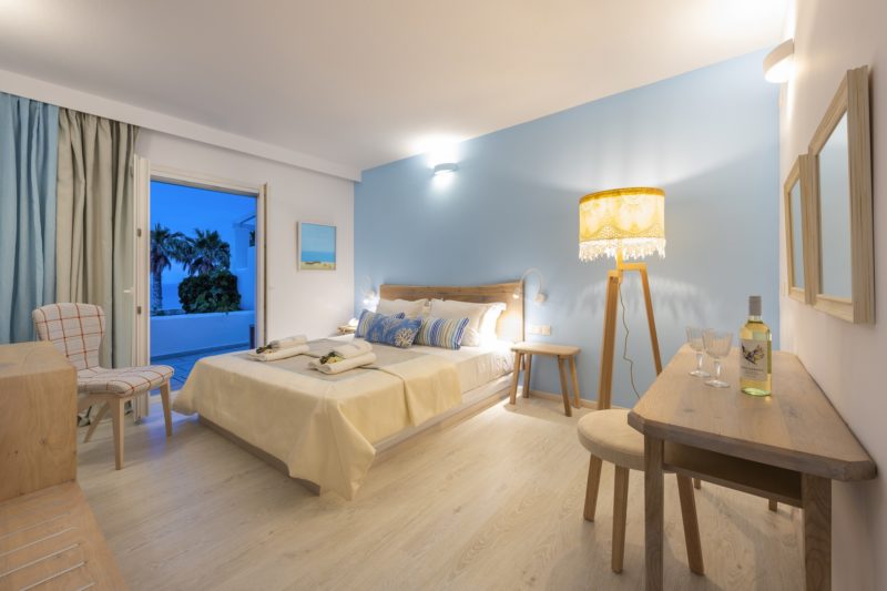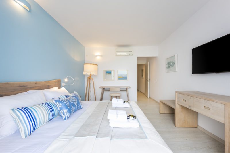Μια κύρια κρεβατοκάμαρα για τους γονείς, με θέα στη θάλασσα και διπλό κρεβάτι , ενδιάμεση πόρτα, και ένα δεύτερο υπνοδωμάτιο με δύο μονά κρεβάτια , και μία ή δύο πολυθρόνες που μπορούν να μετατραπούν σε μονά κρεβάτια .