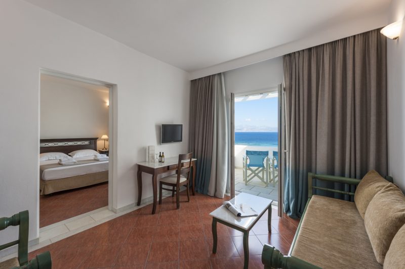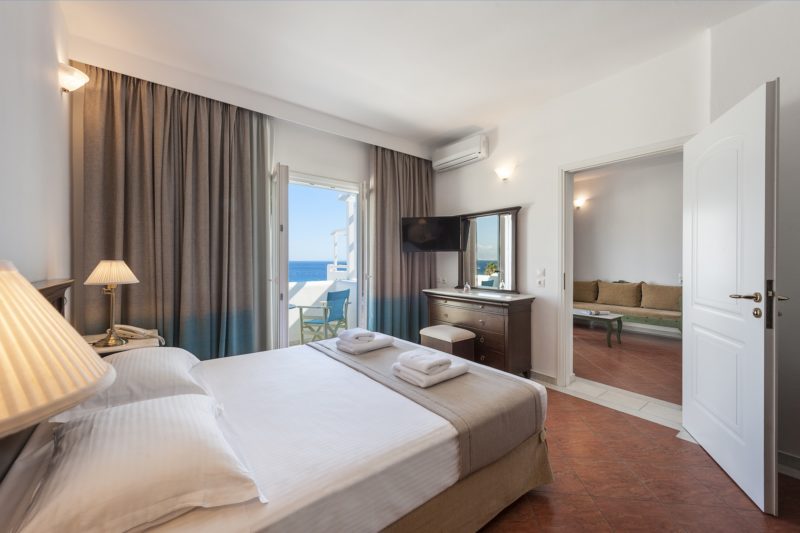 Balcon ou terrasse meublés avec vue sur la mer à couper le souffle. Une chambre principale avec vue sur la mer et un coin salon avec un mobilier élégant.